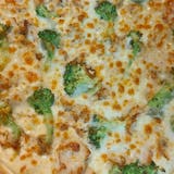No red sauce. Grilled chicken, alfredo sauce, broccoli, garlic.